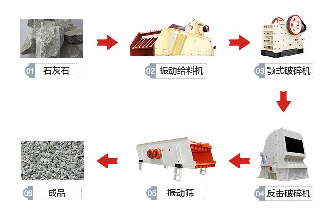 有给料机将原料输送到颚式破碎机,经过粗碎环节处理后,输送到中间料仓,再输送反击式破碎机进行细碎作业,将细碎后成品经过四台振动筛处理,筛分出4中不同规格成品,分别是0-5,5-10,10-20,20-30mm石子。