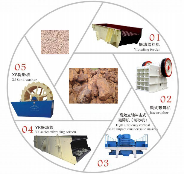 需要加工的物料先经由粗破设备简单破碎,再进入中细碎设备中加工,由筛分设备进行合理筛分,不合格的返回上一级重新破碎,满足需求的则进入制砂设备内加工,成品砂石由洗砂机进行清洗,即可得到高标准的砂石骨料。