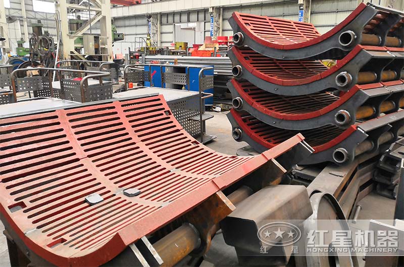 (2)重锤破排矿口设计有箅条,可以对成品石子的粒径和粒形进行控制调整,虽然成品出料品质高了,但由于箅条的设计,如果加工的物料湿度或者黏度过大,则有堵塞的风险。重锤破是通过改变底部箅条间隙来控制排料粒度大小。
