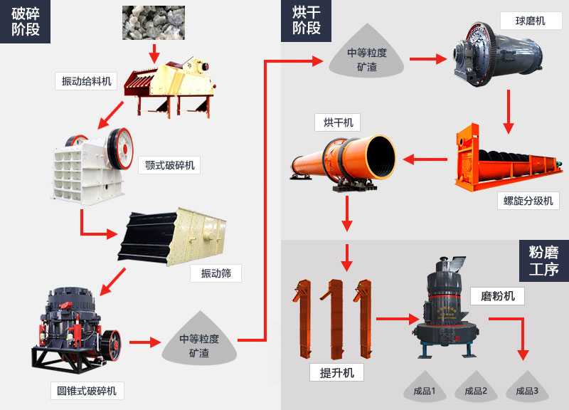 矿渣处理工艺流程主要用到以下设备:颚式破碎机、球磨机、雷蒙磨粉机、烘干机。