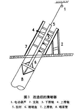 原设计的清堵器拉杆无支撑,在重力作用下发生变形,和下料管的中心线有一定偏移,导致活动不畅。另外,清堵器的下落是靠清堵盘和拉杆的重力作用,而原清堵盘的重量太轻,且结构不合理。